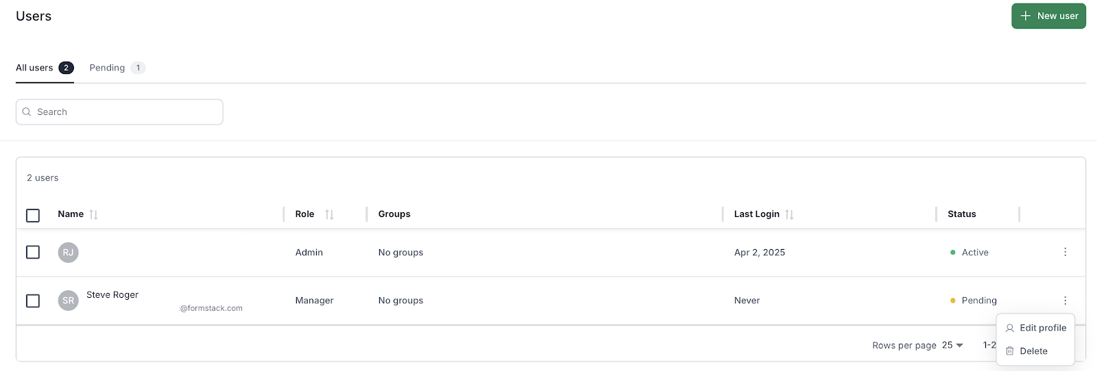 In the Users section, you’ll notice two tabs at the top: All Users and Pending. The All Users tab shows everyone who has accepted their invitation and is actively using the platform. The Pending tab shows users who have yet to accept their invitation. You can use this tab to follow up with or delete users who haven’t responded. You also have the option to edit the profile of each user if you need to make changes to that user.