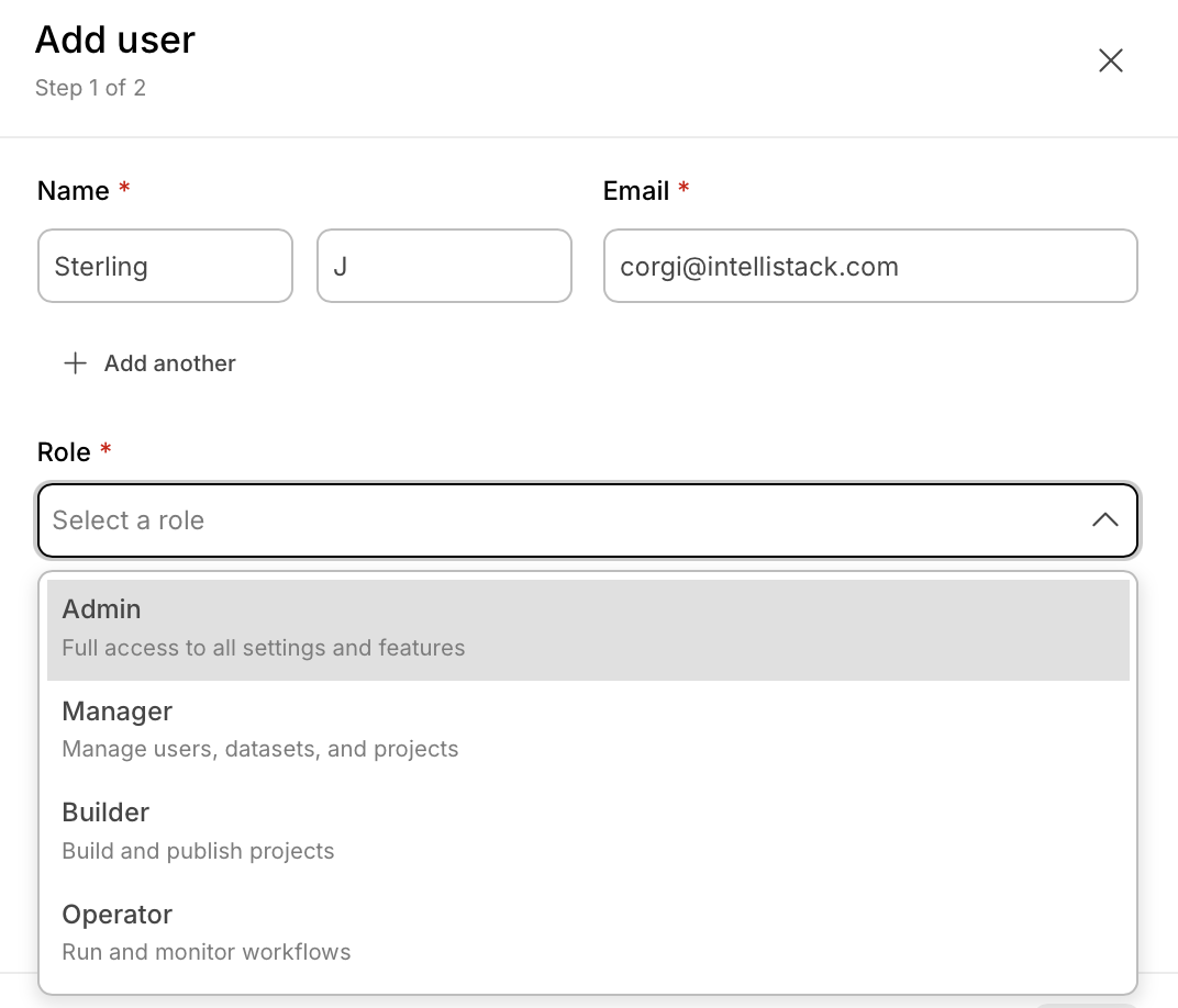 To invite additional users in the same batch, click + Add another and repeat for each user. All users added in a batch share the same role, group membership, and project access configuration. If you need to assign different configurations, create separate batches.