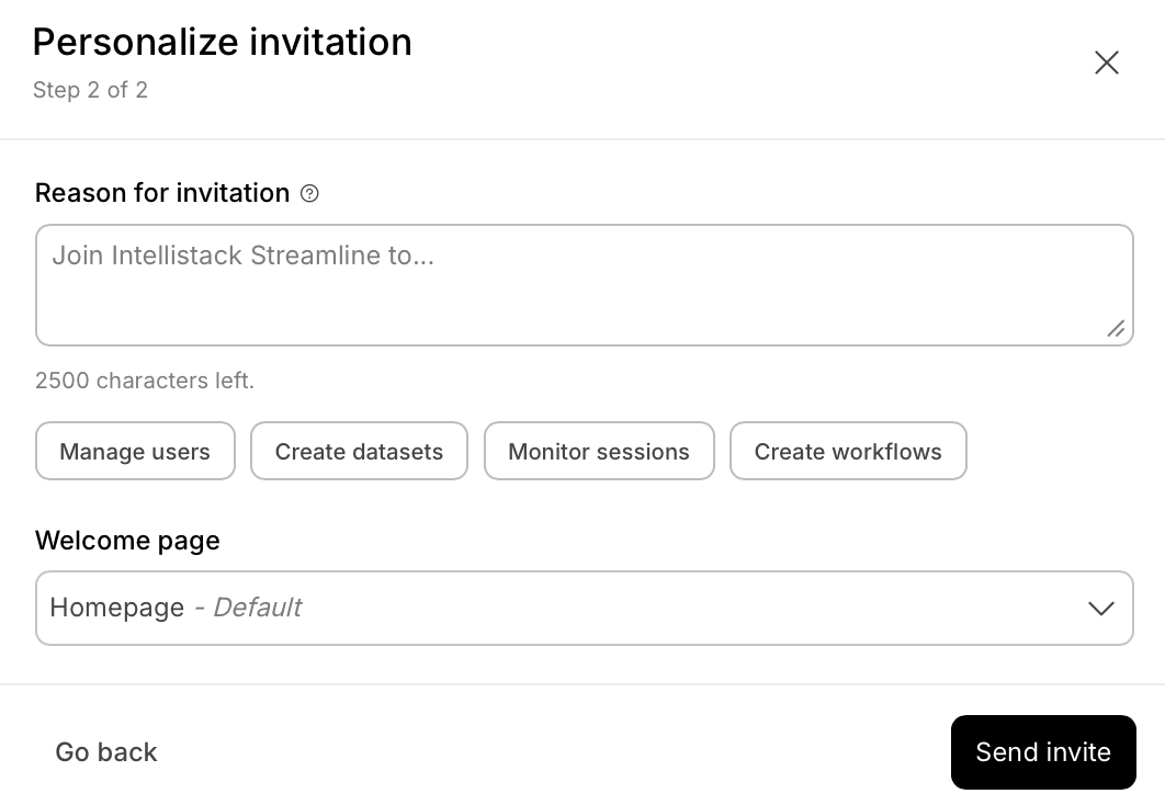 If a user is added through your identity provider rather than through the invitation flow, they will receive a default, role-based first-login experience when they first log in. This default experience includes the welcome modal and role description but does not include a personalized context message, custom welcome page, or inviter attribution.