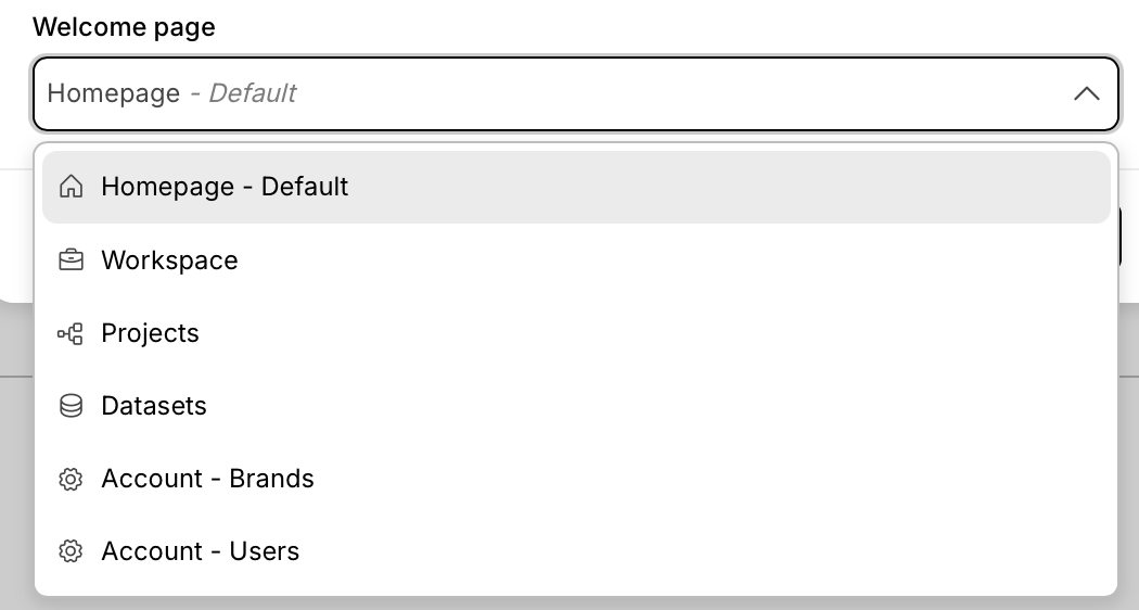 | Admin | Account - Access keys, Account - Brands, Account - Security, Account - Users, Datasets, Homepage (Default), Integrations, Projects, Workspace |