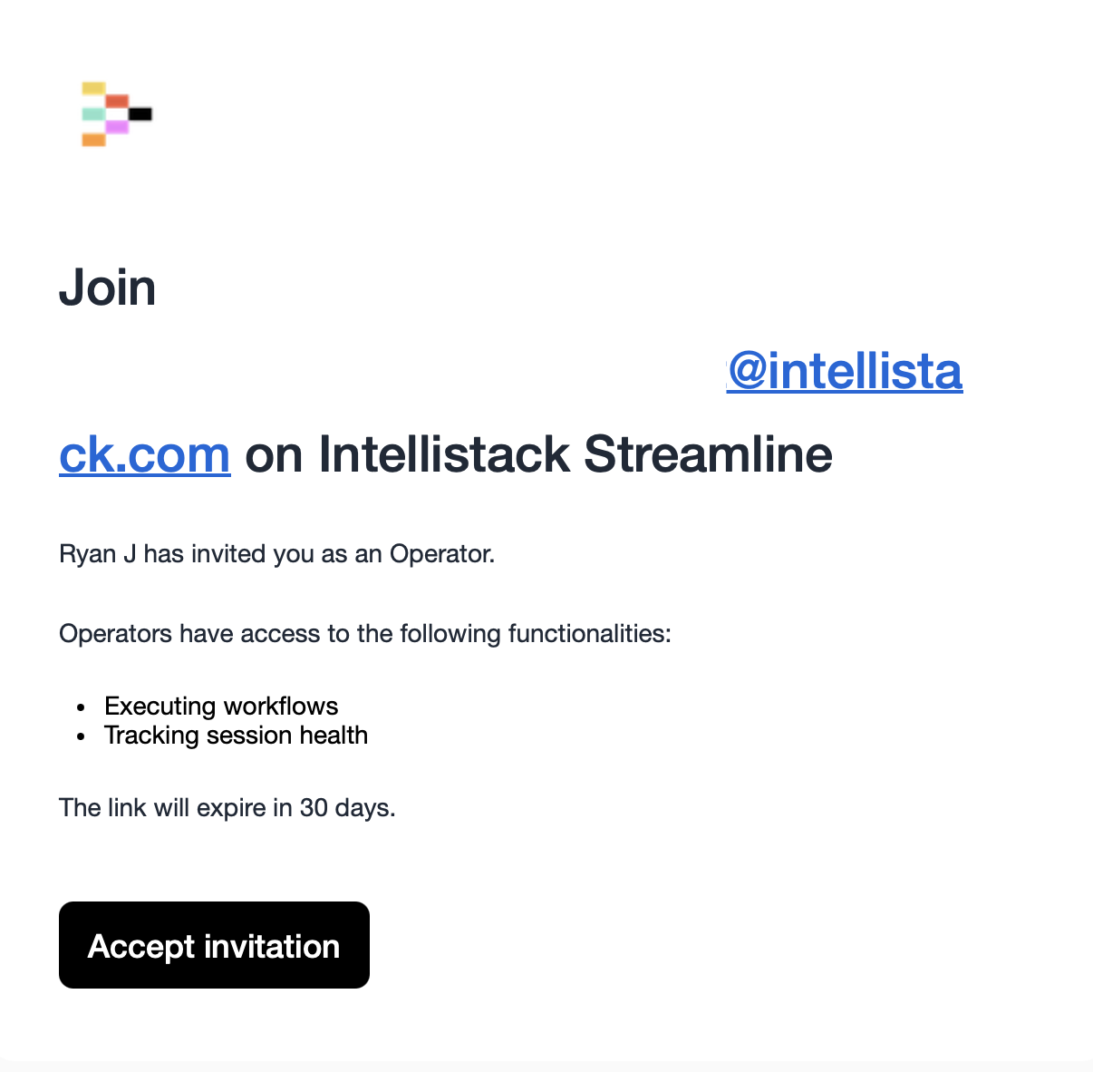 - A header: "Join {Org Name} on Intellistack Streamline"