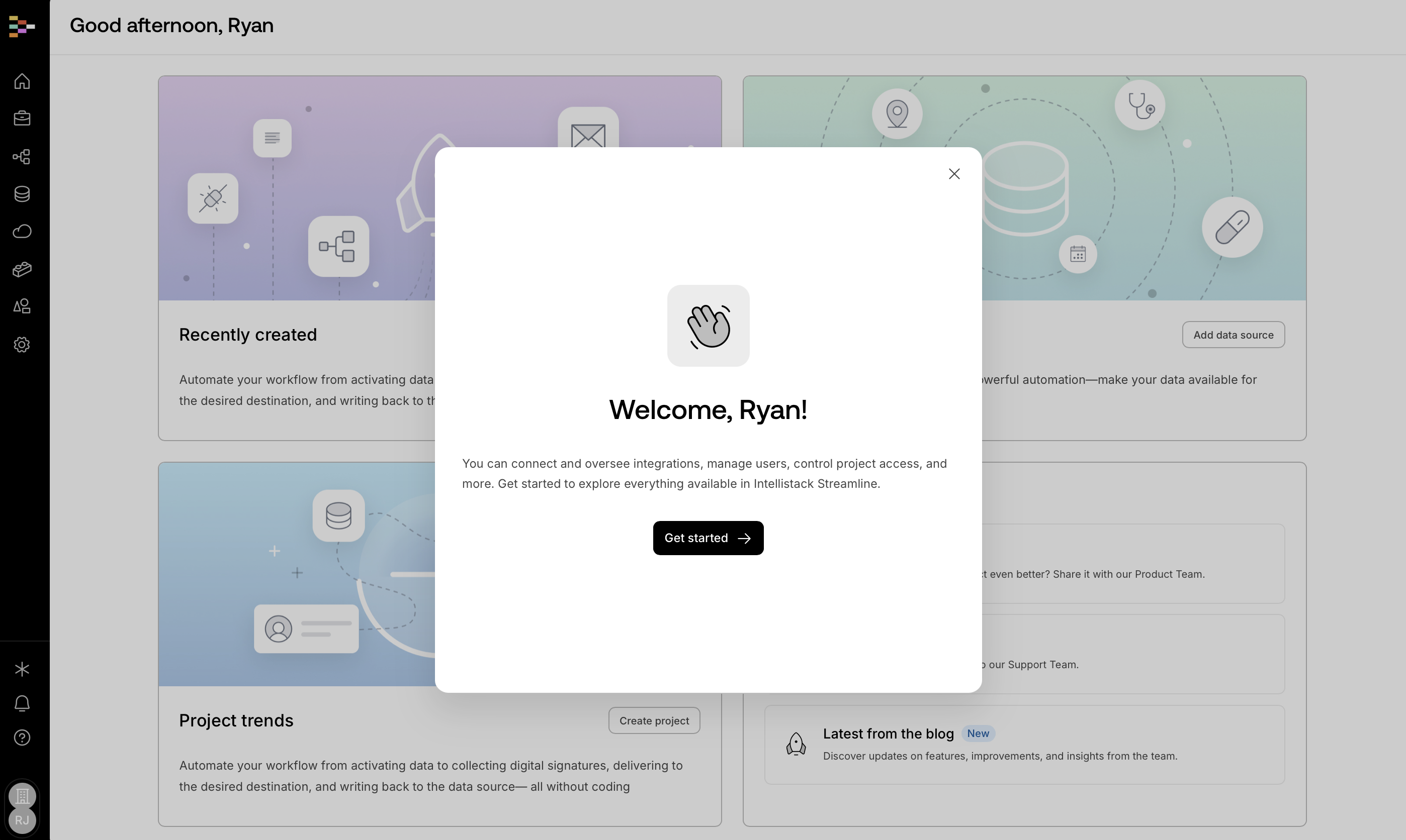 - The user clicks Get started to dismiss the modal.