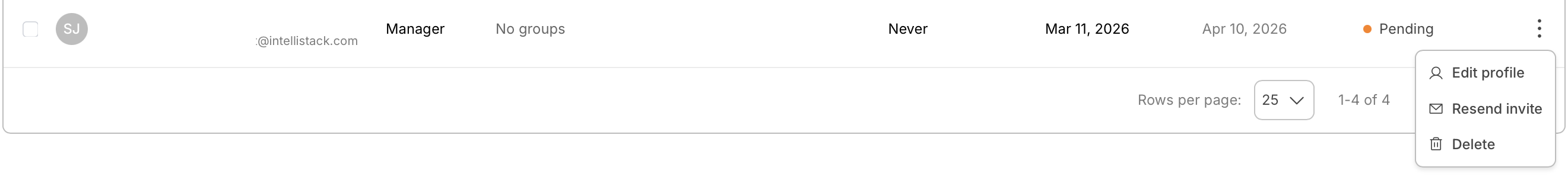 - Resend invite – Send the invitation email again to users who have not yet accepted. The option appears only for pending users whose invitation has not expired.