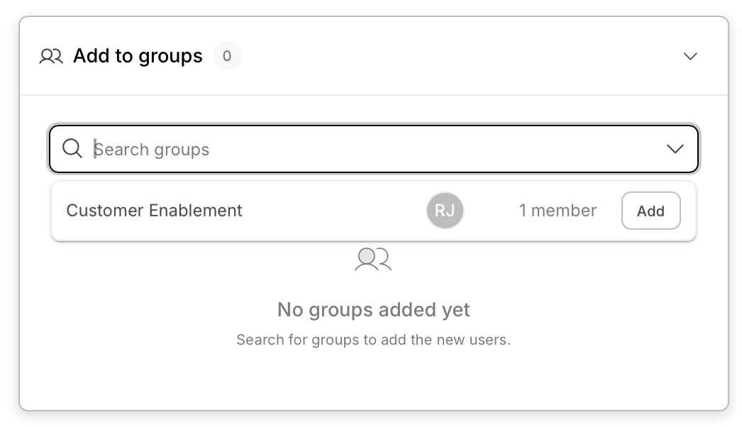 Expand the Add to groups accordion to browse and search available groups. Click Add next to each group you want the user to join. The counter badge on the accordion updates as you make selections. Group membership determines baseline permissions and organizational context for the new user.