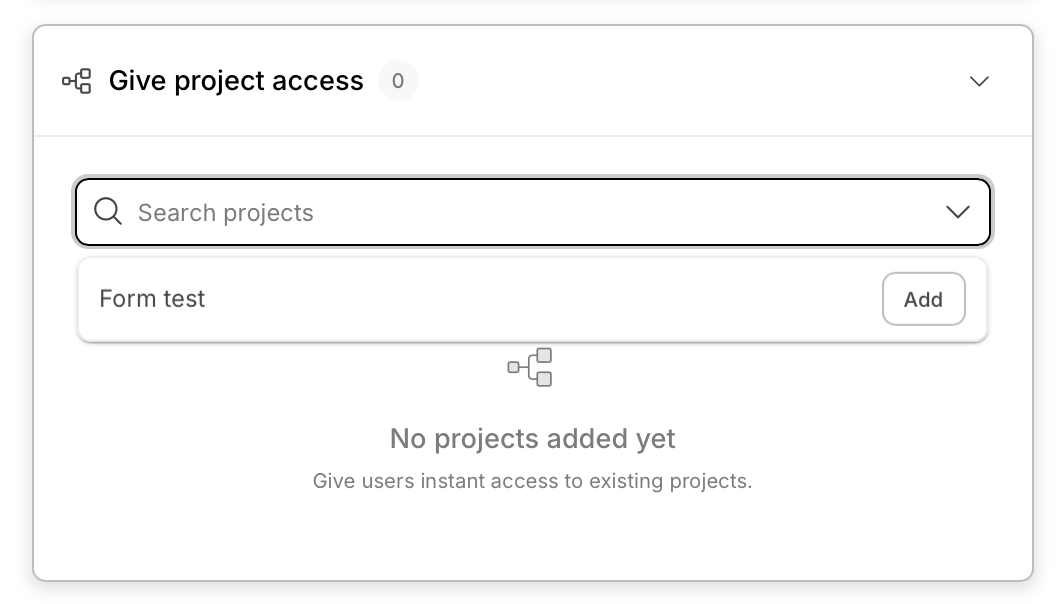 Expand the Give project access accordion to browse and search available projects. Projects the user will inherit through group membership are automatically listed with a Group access badge so you can see what the user will already have. You can grant additional direct project access beyond what groups provide. The counter badge updates to reflect total project access.