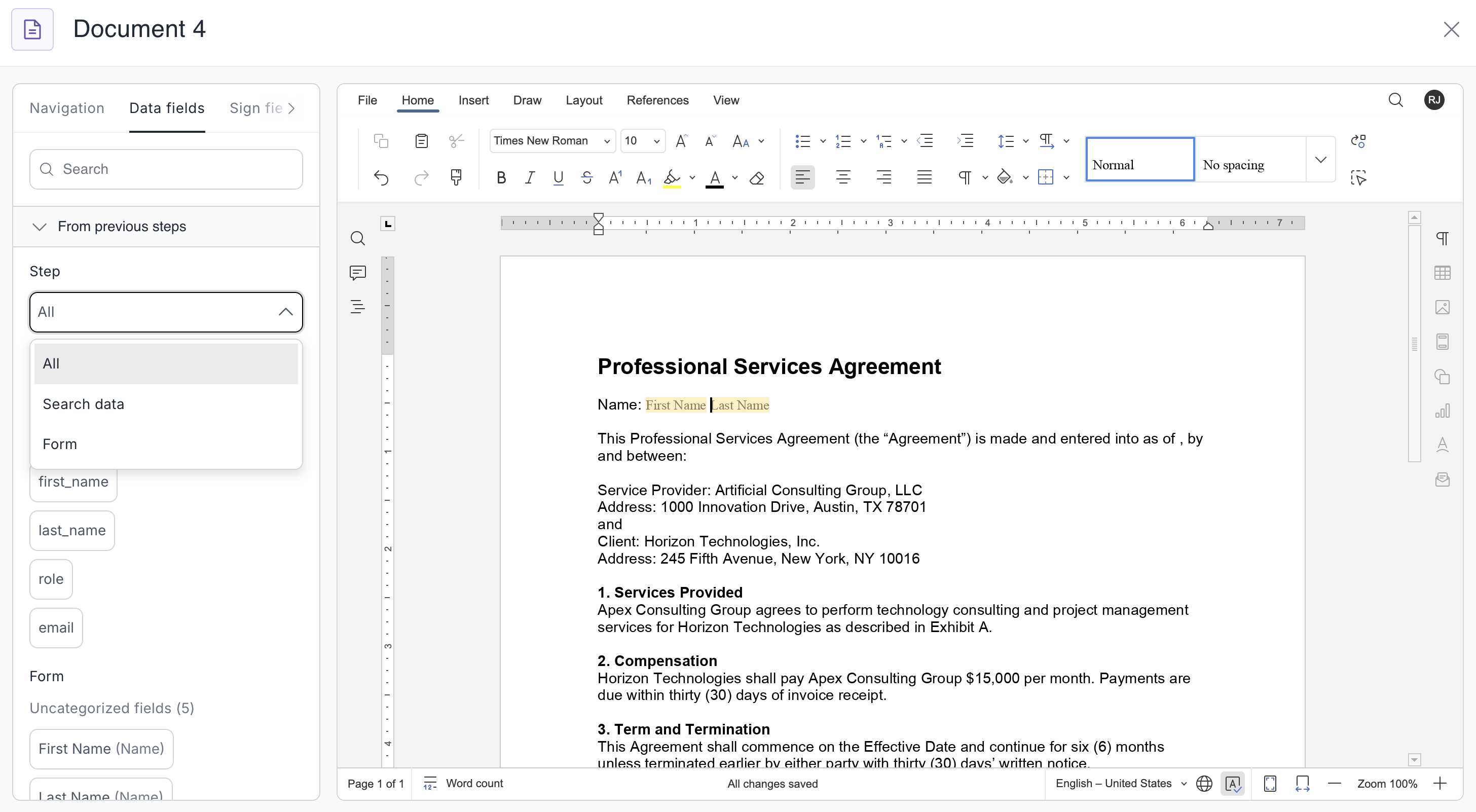 Data fields allow you to pre-fill parts of your document with information already collected during the workflow. This helps reduce manual entry, ensures accuracy, and creates a more dynamic, personalized document experience.