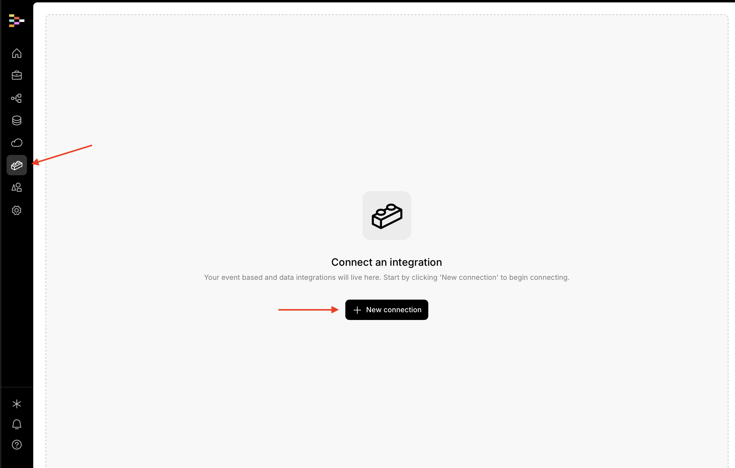 From your dashboard, navigate to the Integrations tab on the left. Click + New connection on the page on the right.