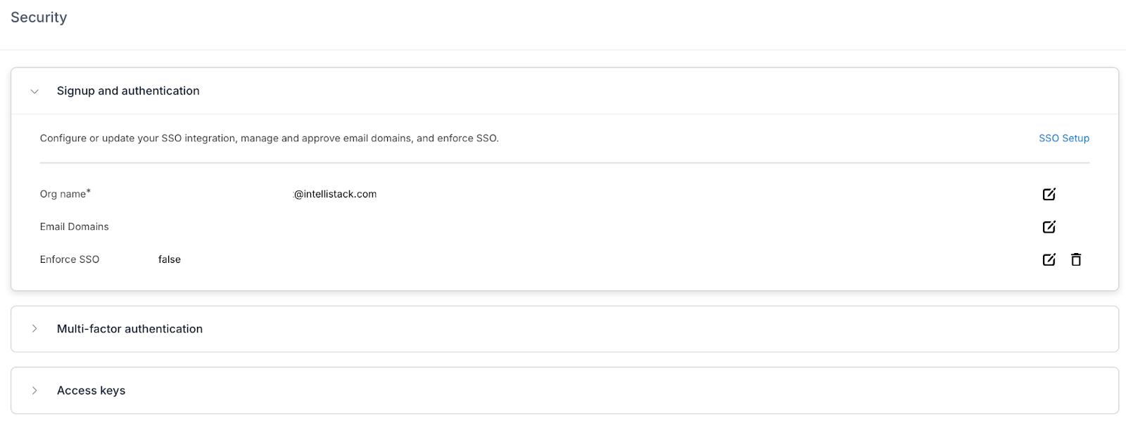 The Signup and Authentication section is where you can configure and update your organization’s Single Sign-On (SSO) integration, manage email domains, and enforce authentication policies.