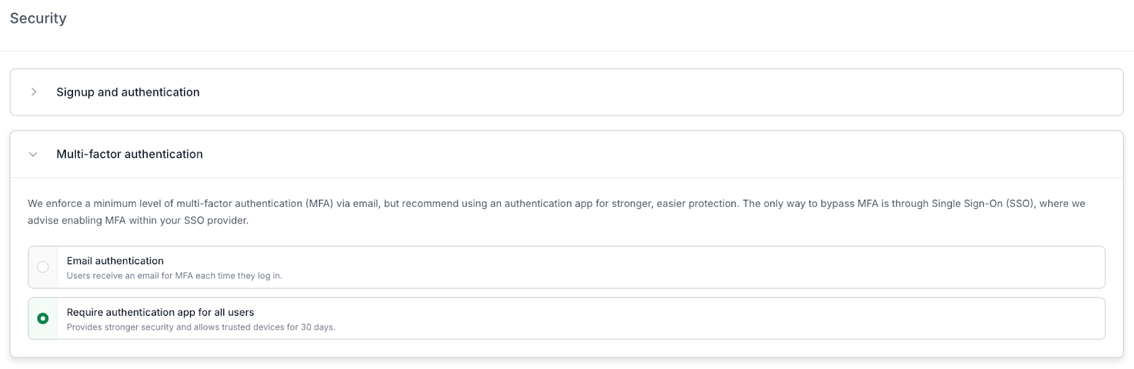 By default, Streamline enforces MFA via email, but admins can strengthen this by requiring an authentication app for all users.