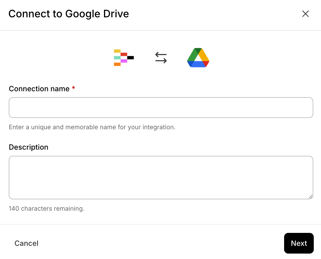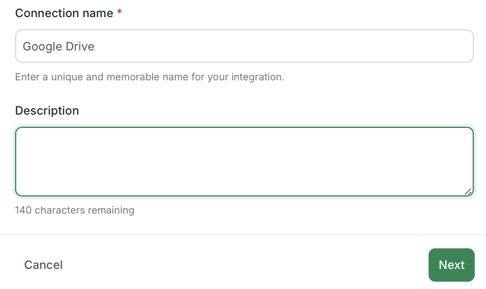 Add a name and description for this integration. Choose something clear and identifiable—e.g., specify the Google account used for this connection.