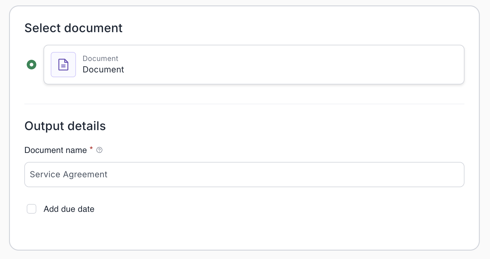 After adding a Document step that generates or uploads your file, add a Sign step to configure how the document will be signed.