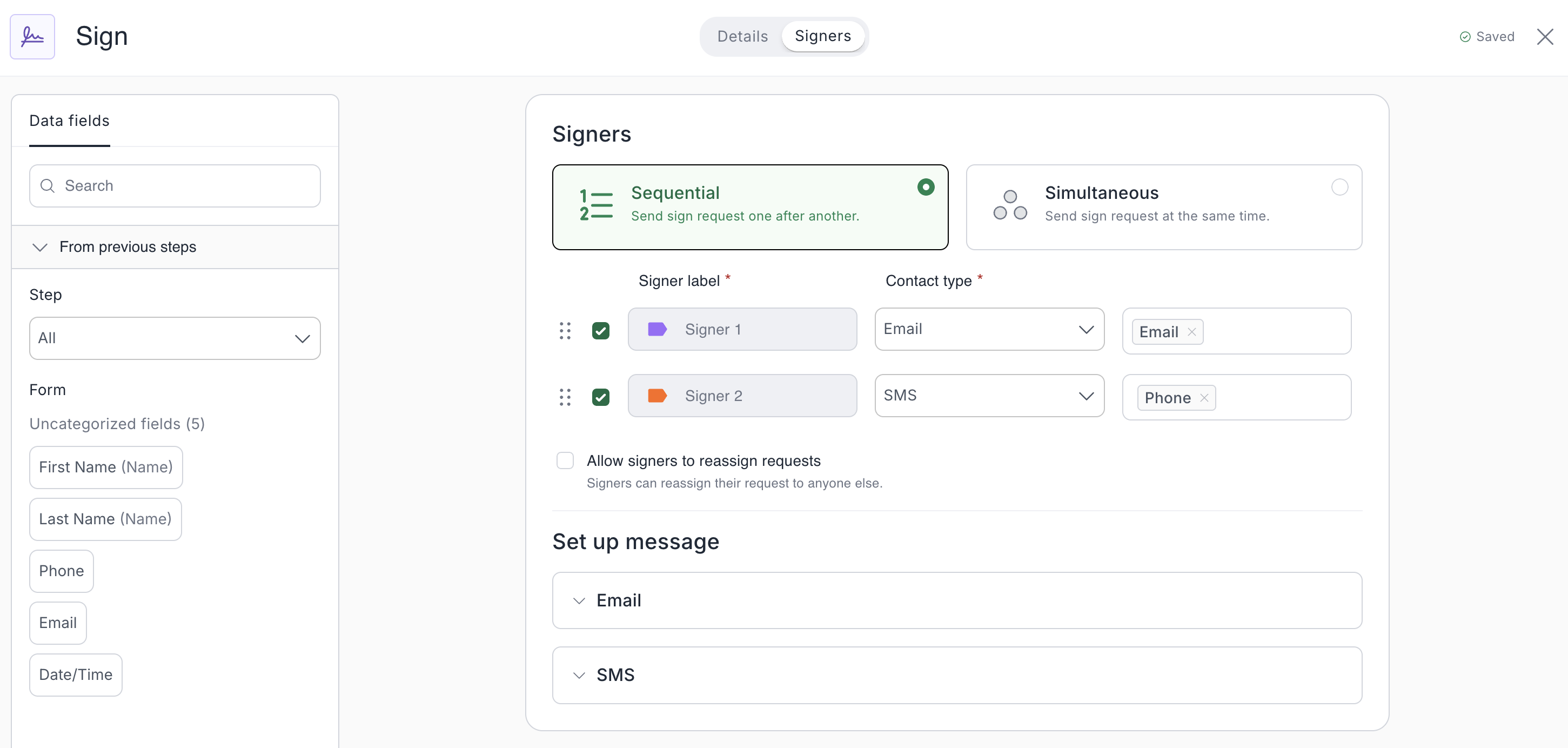 Tip: You can drag and drop Data fields from previous workflow steps listed on the left, such as an email or phone number from a Form step—into the corresponding signer fields. This helps create a more dynamic, automated workflow by pre-populating signer information.