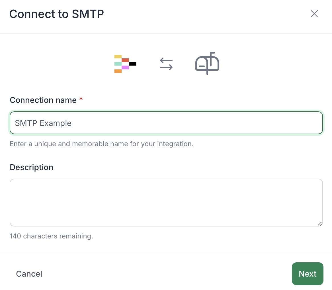 Give your SMTP integration a clear and recognizable name and description, then click Next.