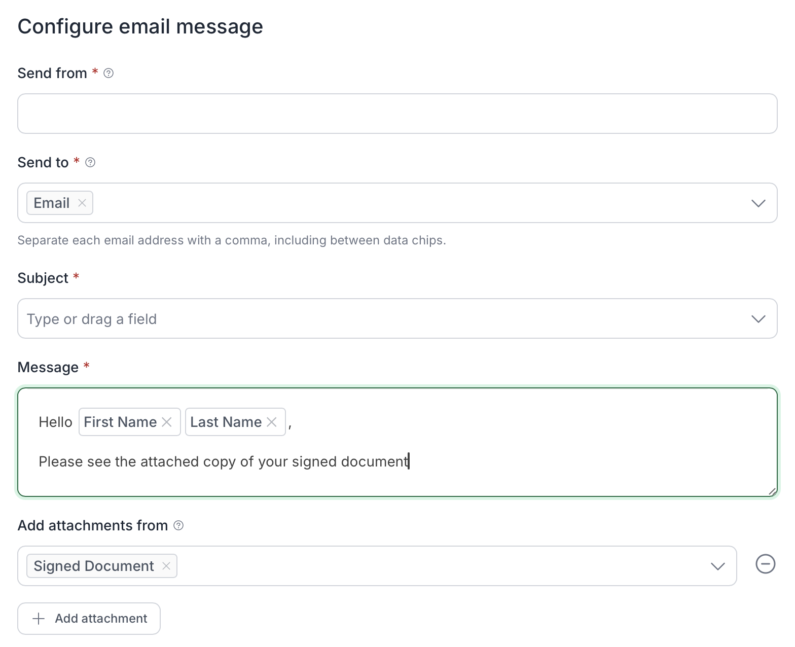 Optional: you can add an attachment if you have documents or files from a previous Form, Document or Sign step. Multiple attachments can be added as needed.