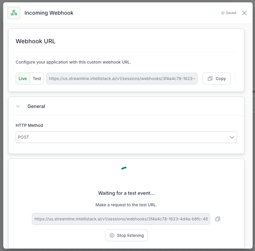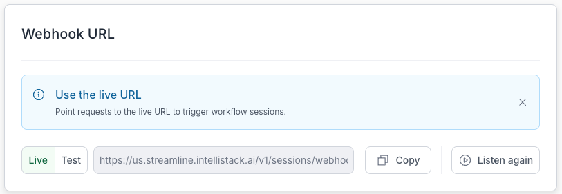 - When ready for production, switch to the Live URL to trigger real sessions.