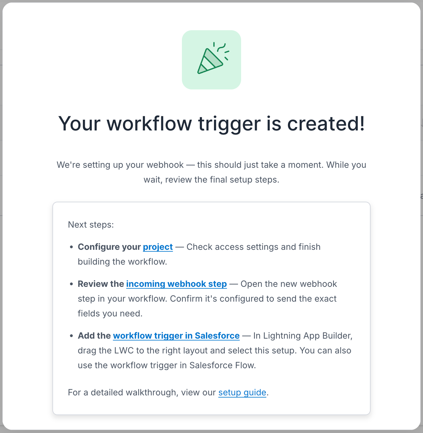 - If not, Streamline will add an incoming webhook step automatically so your Workflow Trigger works right away