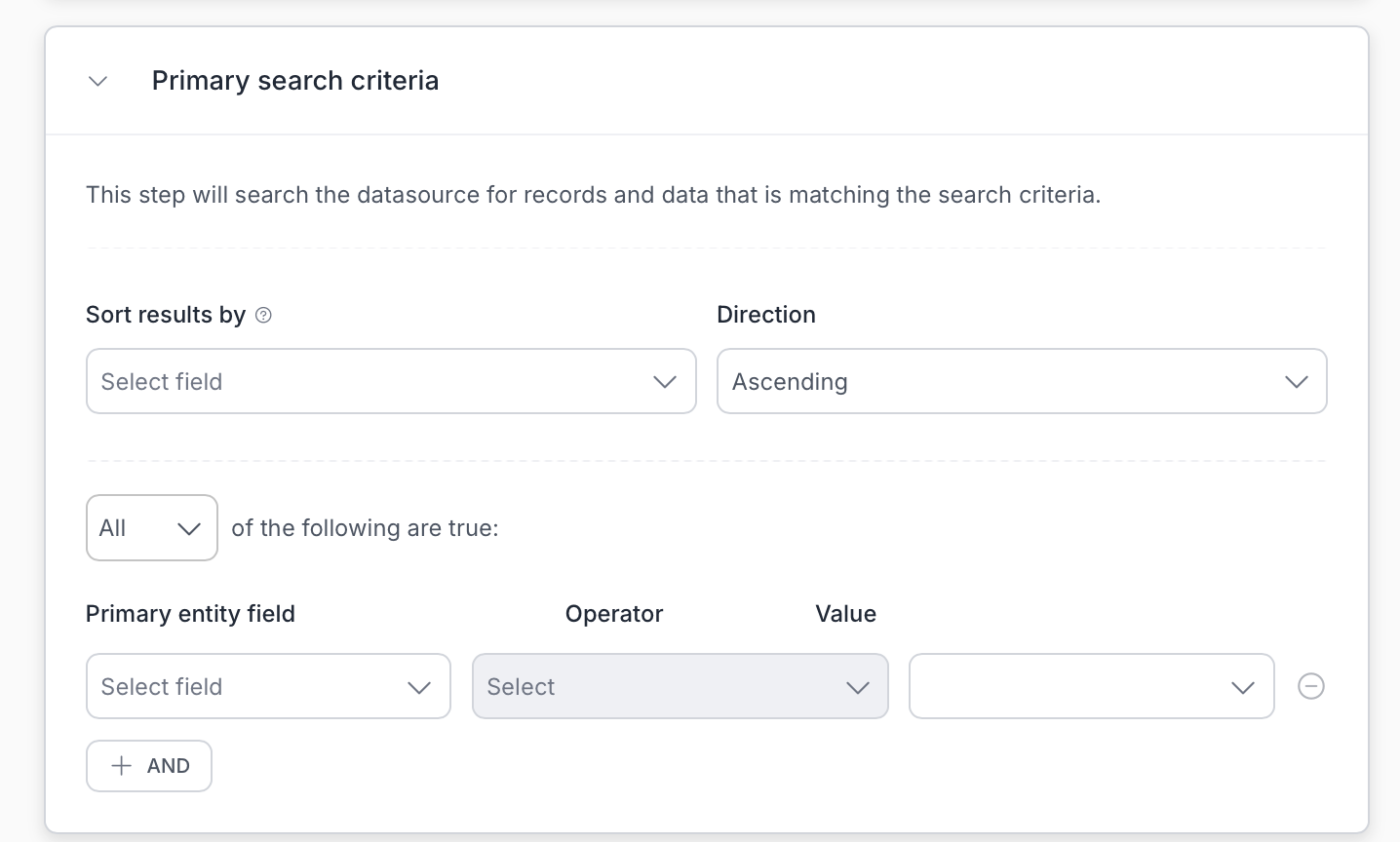 If you haven’t created or connected your datasets yet, we recommend starting with this article before configuring the Search Data step.