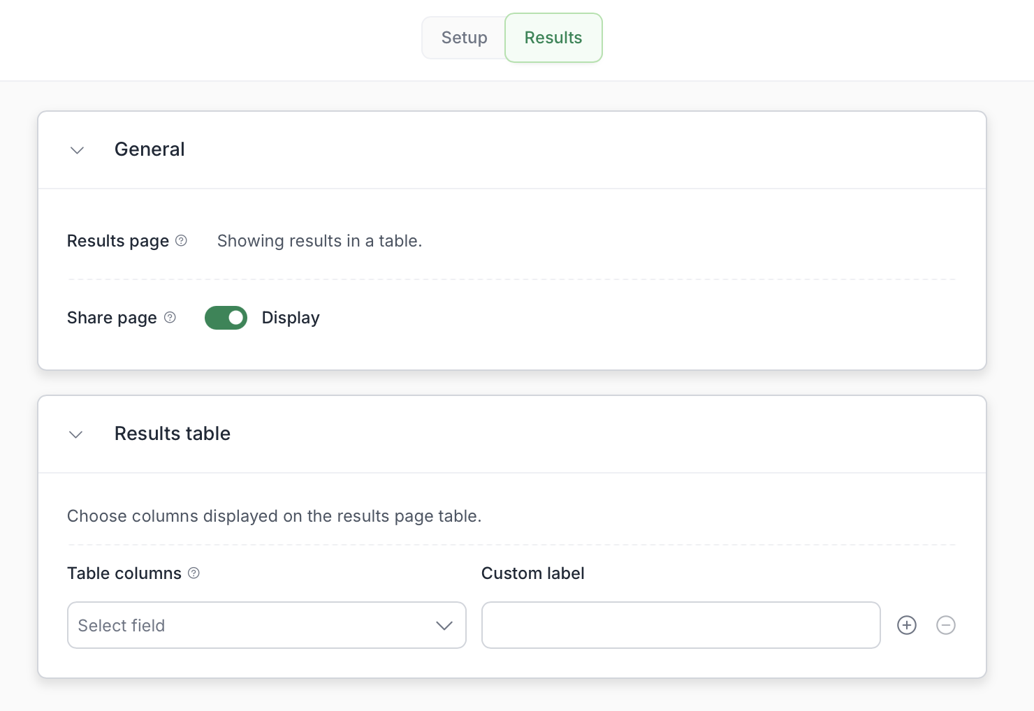 Customize which columns appear in the results page table using the Results tab. You can choose between: