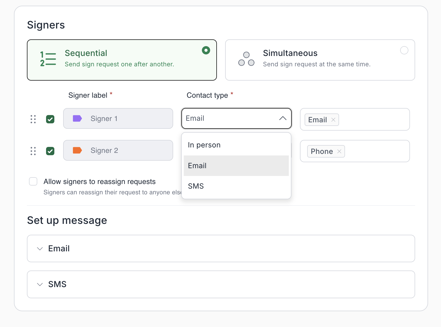 Each signature field in the document corresponds to a signer in the Sign step. For each signer, you can configure delivery settings, contact methods, and message customization.