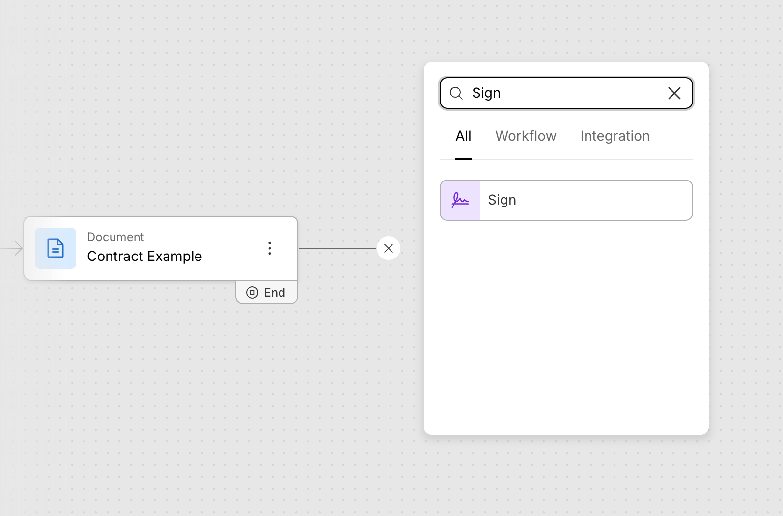 After adding a Document step that generates or uploads your file, add a Sign step to configure how the document will be signed.