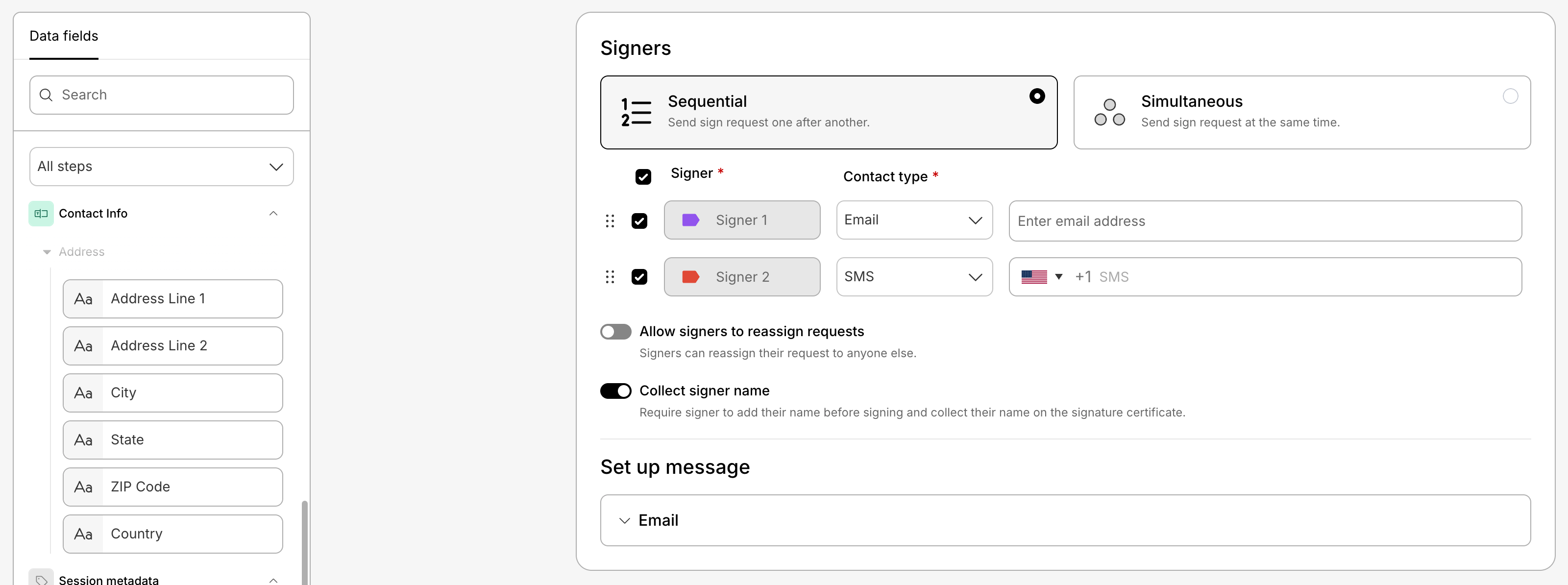 Tip: You can drag and drop Data fields from previous workflow steps listed on the left, such as an email or phone number from a Form step—into the corresponding signer fields. This helps create a more dynamic, automated workflow by pre-populating signer information.