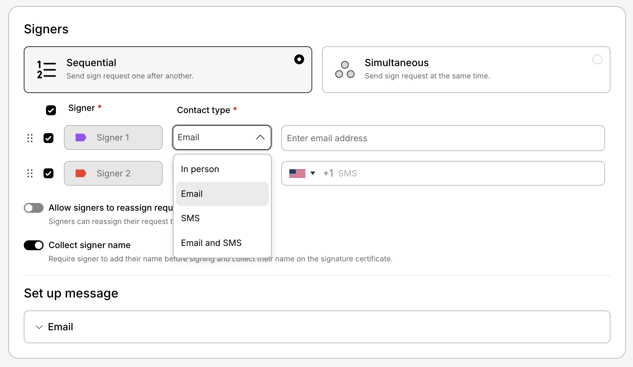 - The option to use sequential or simultaneous for the signing order is only available if you have multiple signers.