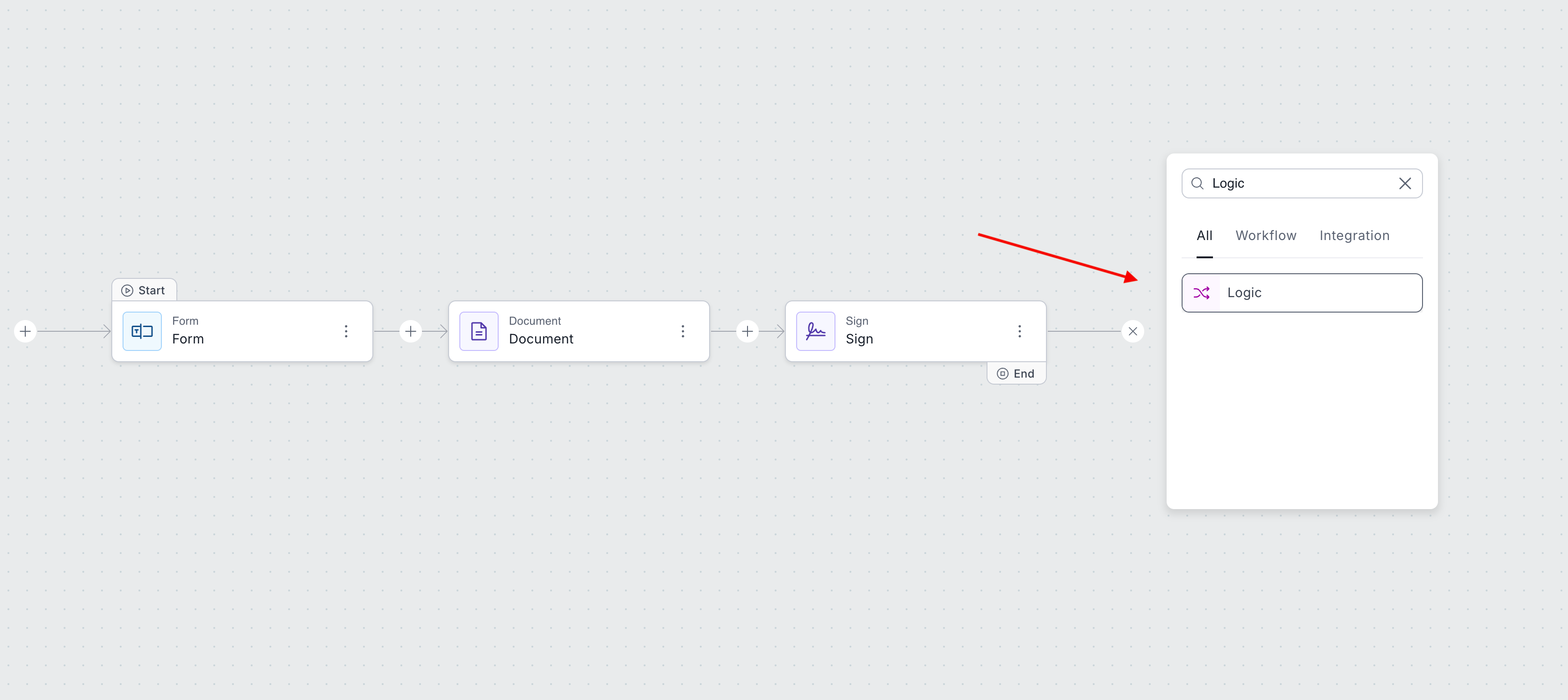 To get started, place your logic step on the builder. We'd recommend placing this step after or between the steps that you'd like to reference. For instance, let's say you'd like to only send out a notification email step if a condition was met on a form, like a customer opting to receive an email.