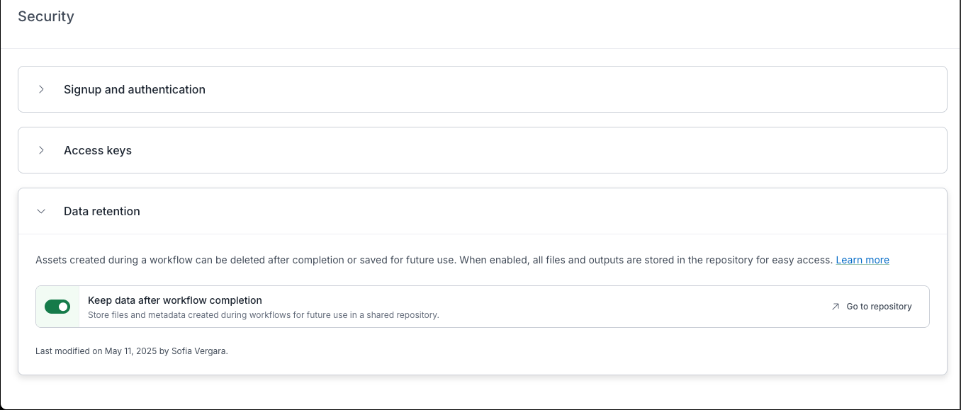 If your organization requires that generated assets not be stored for compliance, privacy, or security reasons, you can disable this setting. Disabling this option ensures that all files and metadata are deleted automatically once a workflow completes.