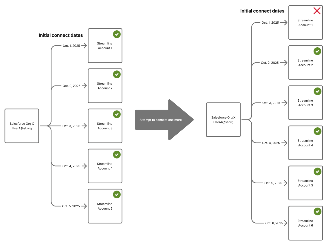 - Each Salesforce user can only have up to five active connections to an external system like Streamline.