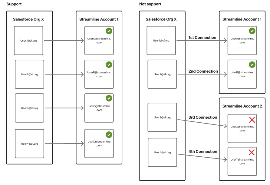 - Although each Salesforce user establishes an individual connection, all user connections within the same org are limited to connecting to users in the same Streamline account.