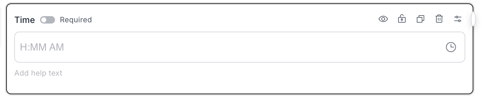 Time fields allow you to collect time-specific information from respondents in a clean, structured format. Time fields are ideal for capturing details such as appointment times, meeting schedules, availability windows, or start/end times for events. This field is excellent for when there is a Time that doesn’t need to be associated with a date.