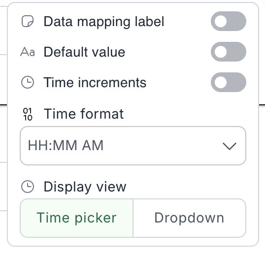 - Choose Time Picker for quick, intuitive selection or Dropdown for more controlled and accessible input.