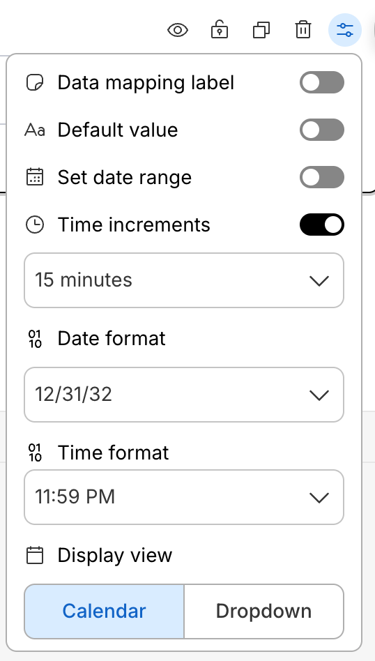In the field settings panel on the top right, you can configure how the field behaves and how respondents select both date and time.