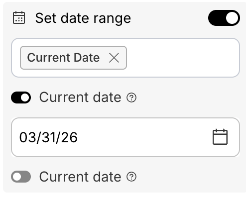 Define a minimum and maximum date that respondents are allowed to select. For example, use the "Current Date" toggle to create a dynamic date range that always considers when the form is being completed.