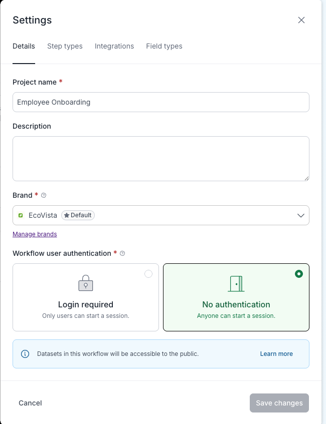 When creating a new workflow, your account-level default brand will be applied to your Workflow. If you'd like to adjust the brand, you can go into the settings of your Workflow and edit the brand from the brand dropdown.