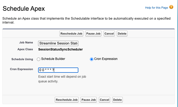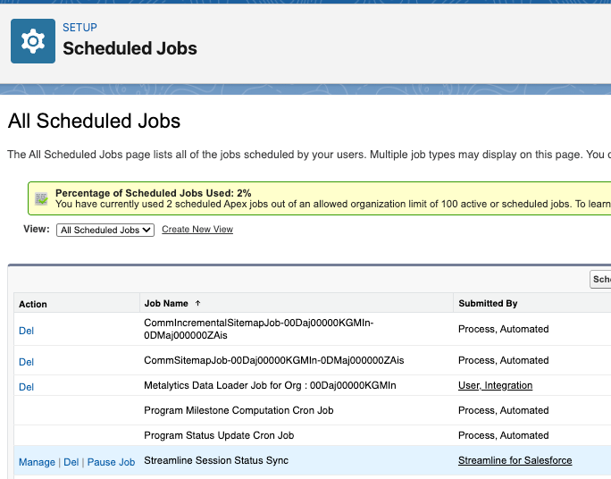 - Automated batch job – By default, runs hourly to sync all active session data from Streamline to Salesforce. The batch processes records in groups of 10 to stay within Salesforce API limits. You can adjust this frequency in Salesforce Setup under Scheduled Jobs.