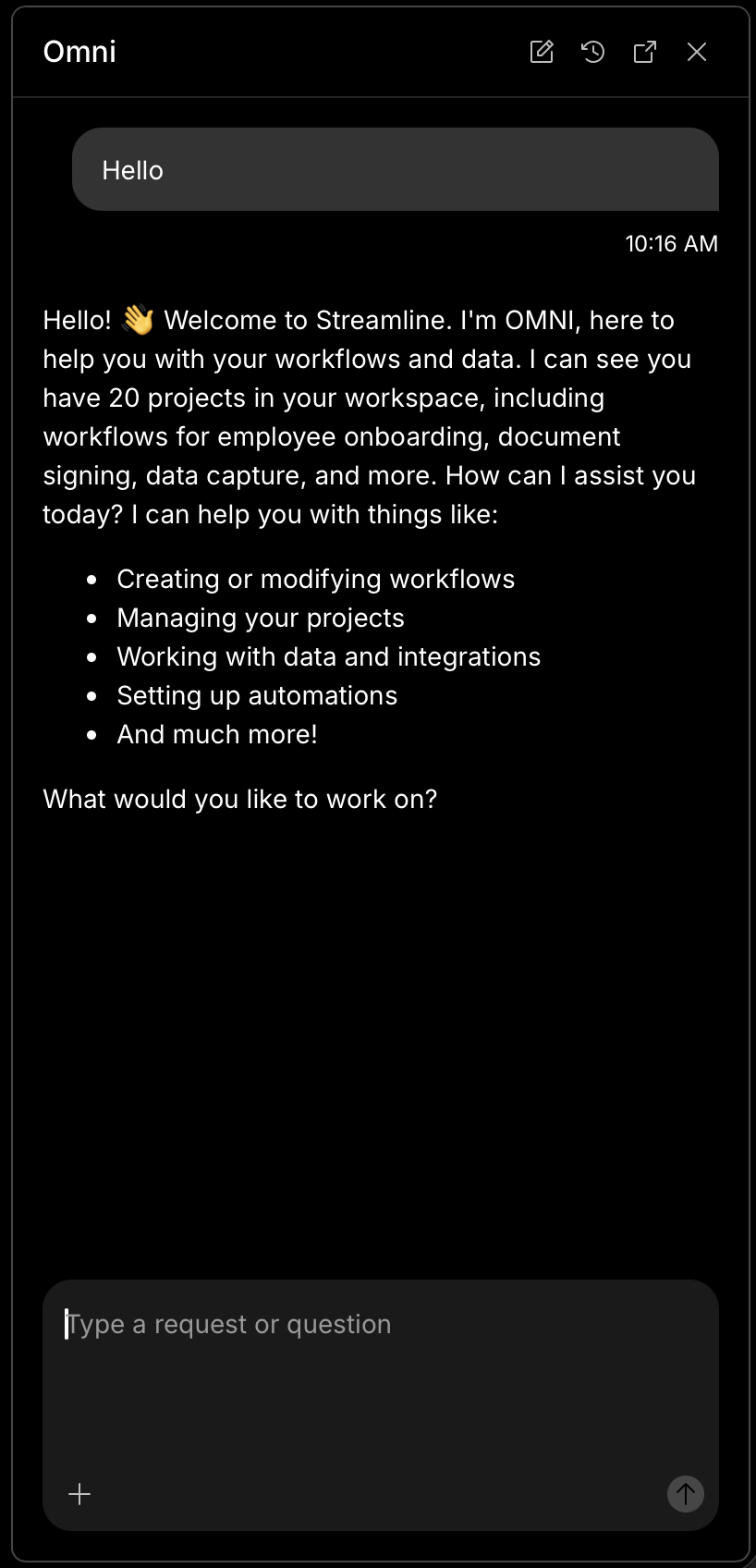 Omni is your built-in AI assistant inside the Streamline platform. Designed to help you move faster and work smarter, Omni allows you to interact with Streamline using plain language to build workflows, manage data, configure documents, and monitor activity.